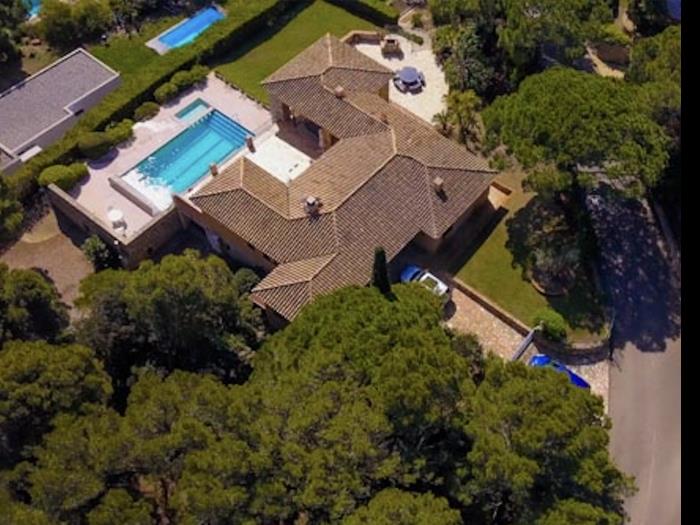 The outdoor areas are equally inviting. A substantial built-in barbecue area, complete with a round metal dining table and seating, sets the scene for relaxed summer gatherings. Steps lead down to a large swimming pool surrounded by sun loungers, offering a peaceful spot to unwind beneath the Mediterranean sun. To one side of the villa, a small olive orchard and a private boules court add charm and recreational space, while the natural garden filled with mature trees and colourful flowers creates a lush and tranquil atmosphere.