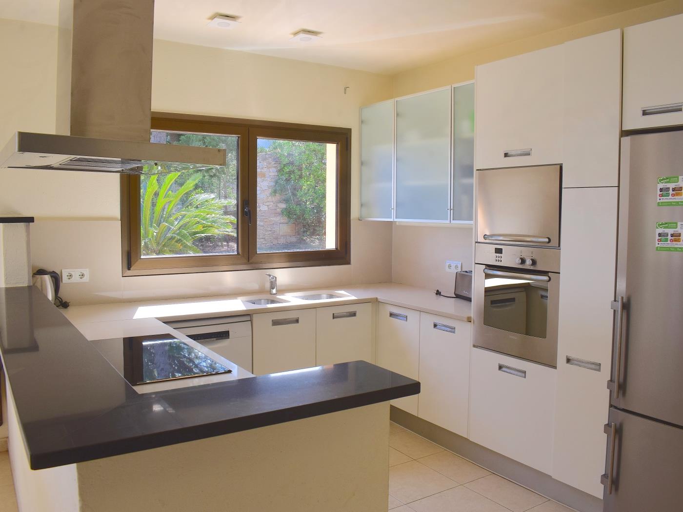 Upon entering, you are welcomed into a bright and immaculate kitchen designed in elegant white tones, where clean lines and a fresh, contemporary aesthetic create an immediate feeling of light and calm. The kitchen flows effortlessly into an open-plan lounge area, where expansive windows frame sweeping views over the rugged Costa Brava coastline and the shimmering Mediterranean Sea. Natural light floods the space, enhancing the connection between indoors and out.