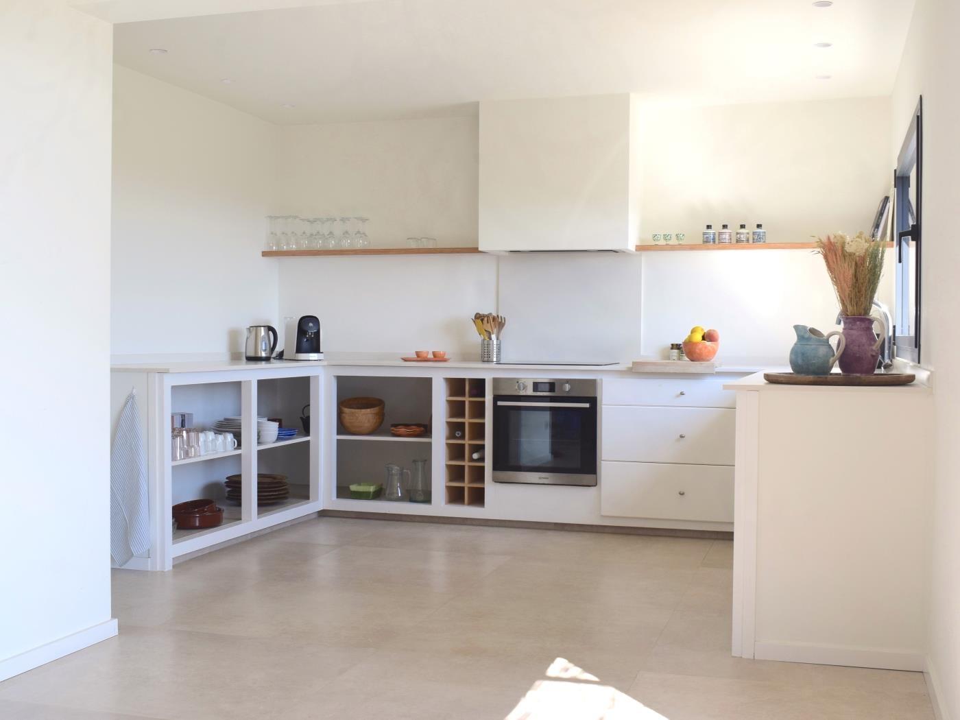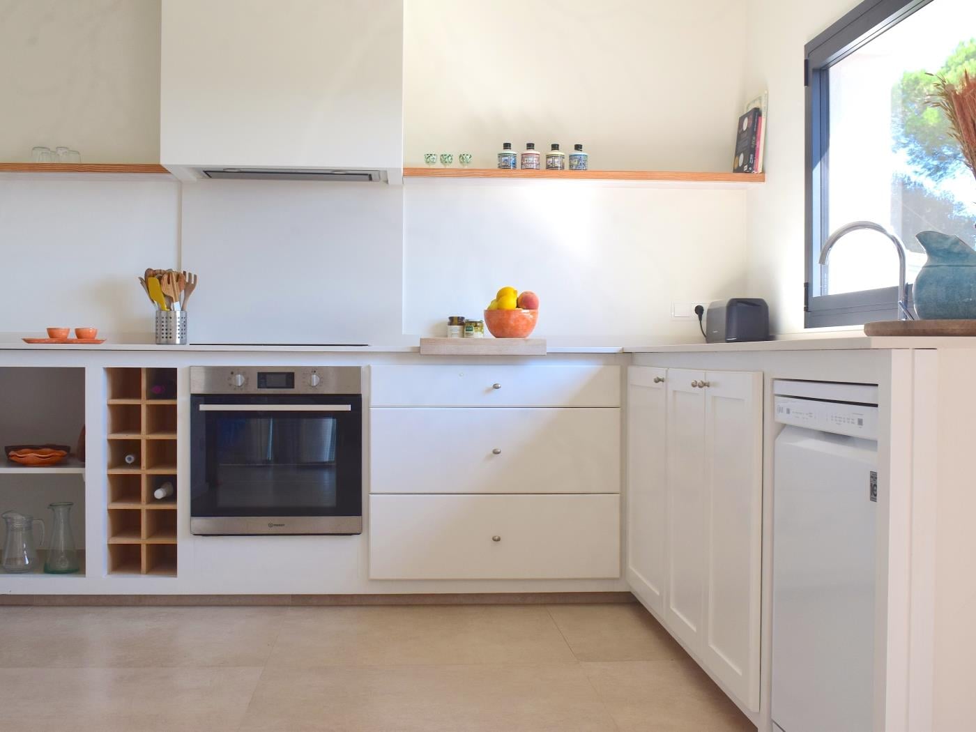 La cocina moderna totalmente equipada se encuentra cerca, en un diseño blanco luminoso con abundante luz natural y todo lo necesario para una cómoda estancia de autoservicio en Tamariu. Grandes puertas correderas abren a la terraza superior, donde una cómoda zona de asientos permite disfrutar de la brisa costera y las vistas panorámicas.