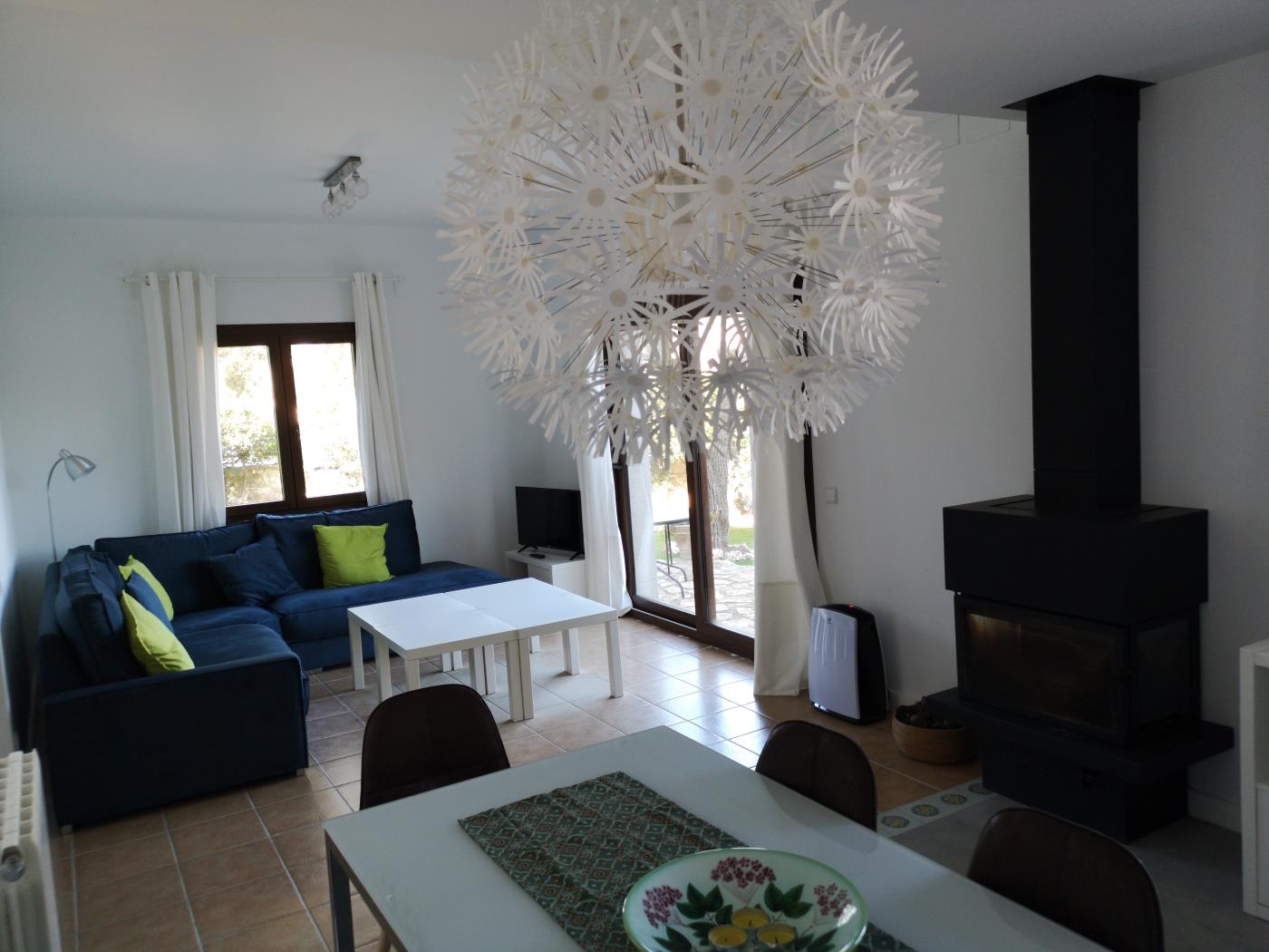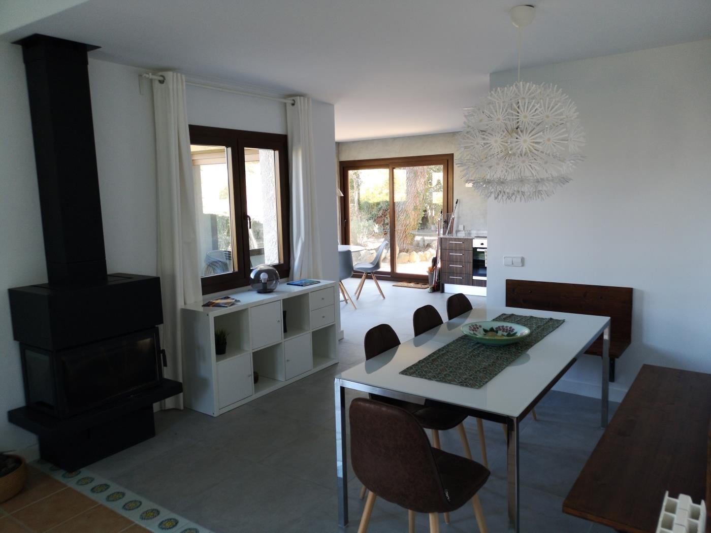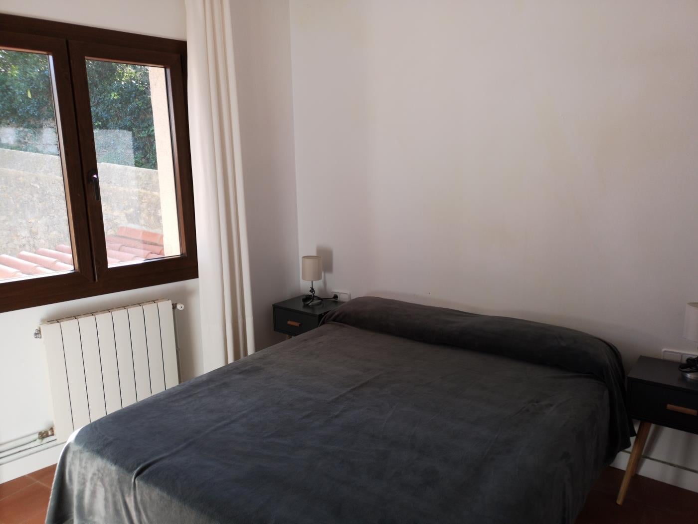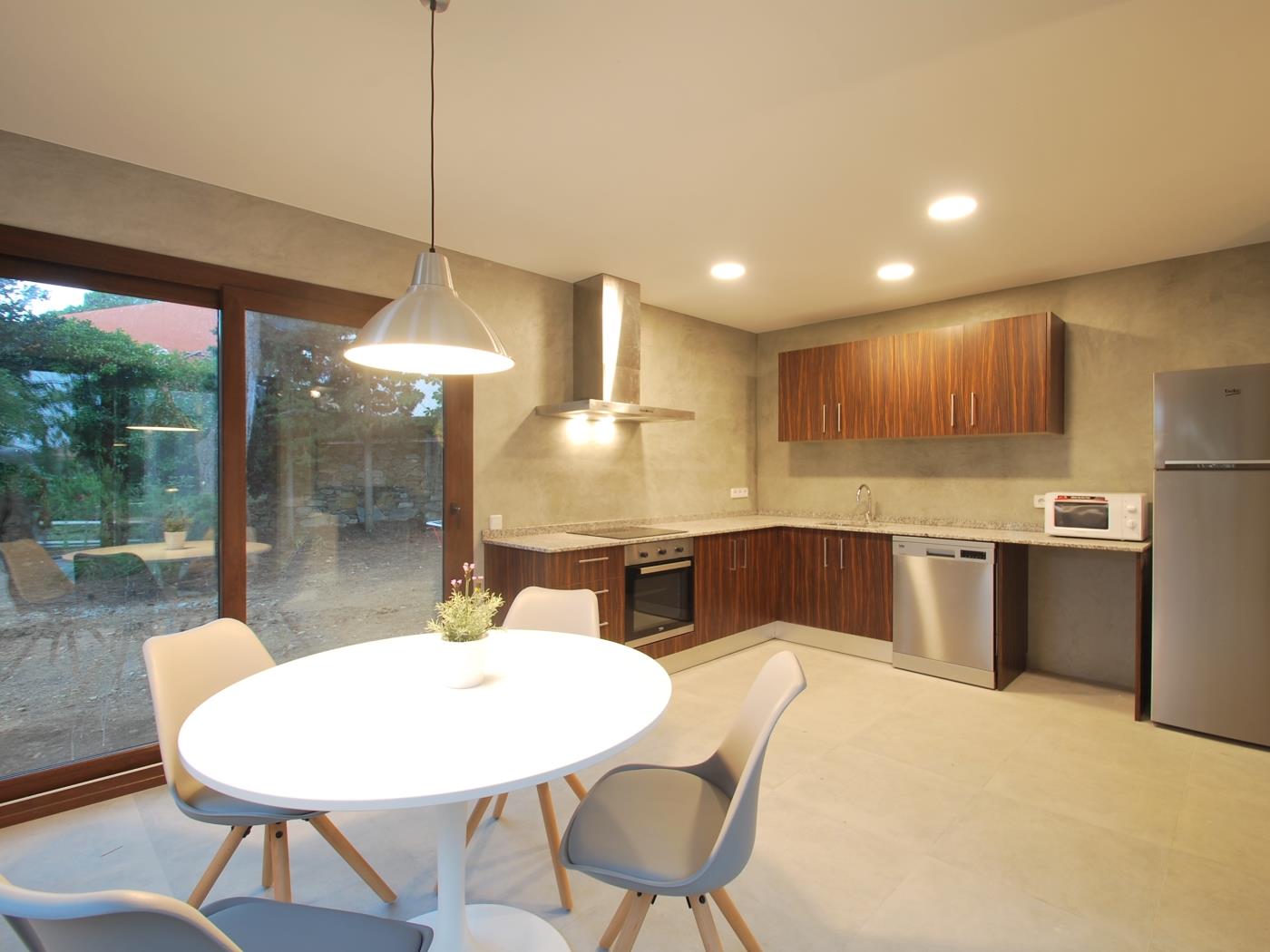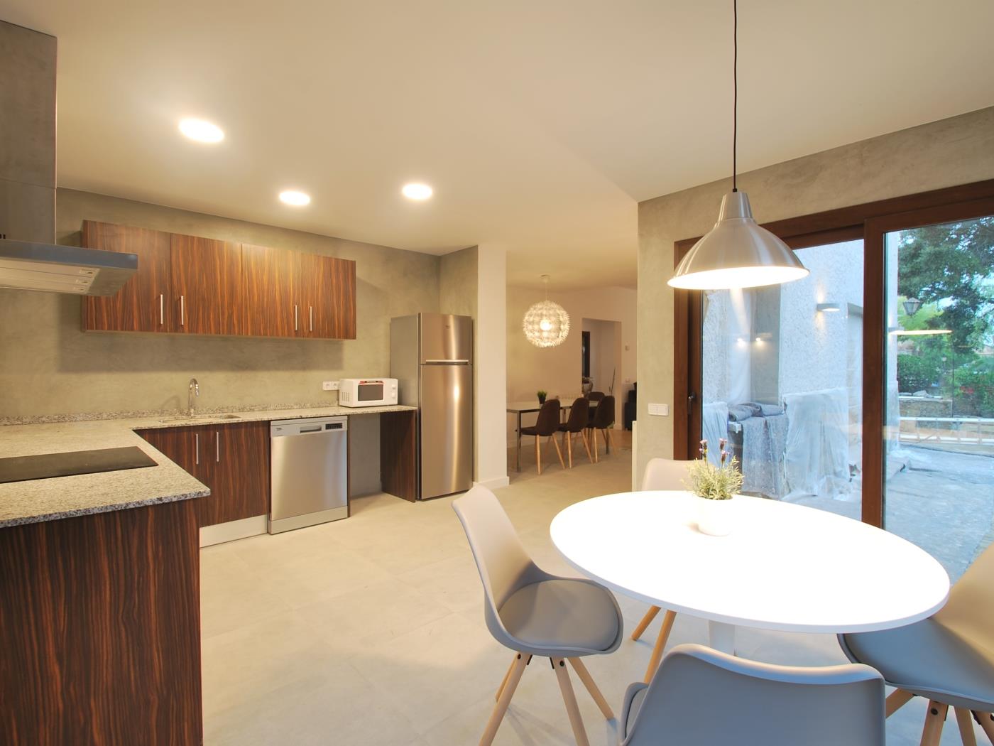 De woonkamer beschikt over een grote comfortabele bank en openslaande deuren die direct naar de tuin leiden. Van hieruit kunt u naar een klein terras met tafel en stoelen stappen, de perfecte plek om buiten te eten of te genieten van het mediterrane klimaat. De eethoek is eenvoudig en uitnodigend, terwijl de keuken royaal bemeten, praktisch en volledig uitgerust is, waardoor deze woning ideaal is voor gasten die een zelfvoorzienend vakantiehuis in Begur zoeken. Openslaande deuren vanuit de keuken leiden direct naar de achtertuin, wat gemakkelijke toegang tot de buitenruimtes biedt.