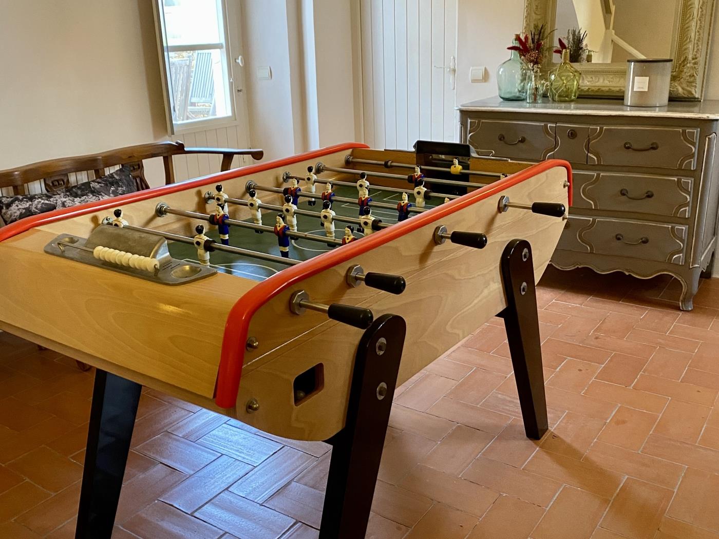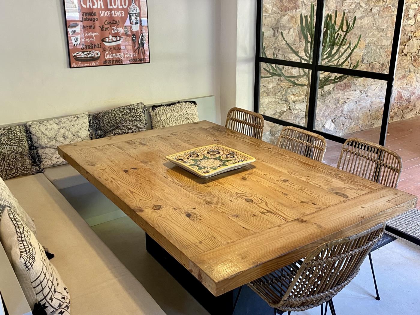 De woonkamer loopt naadloos over in de open keuken, die rustieke charme combineert met moderne functionaliteit. De keuken is volledig uitgerust met kwalitatieve apparatuur, waaronder een Amerikaanse koelkast, vaatwasser en magnetron, en is perfect voor het bereiden van ontspannen vakantiemaaltijden. Aansluitend bevindt zich de eetruimte met een grote houten tafel en ingebouwde zitbank met zachte kussens, waardoor een gezellige plek ontstaat voor gezamenlijke maaltijden en levendige gesprekken. Grote glazen deuren laten veel natuurlijk licht binnen en bieden een mooi uitzicht op de tuin.